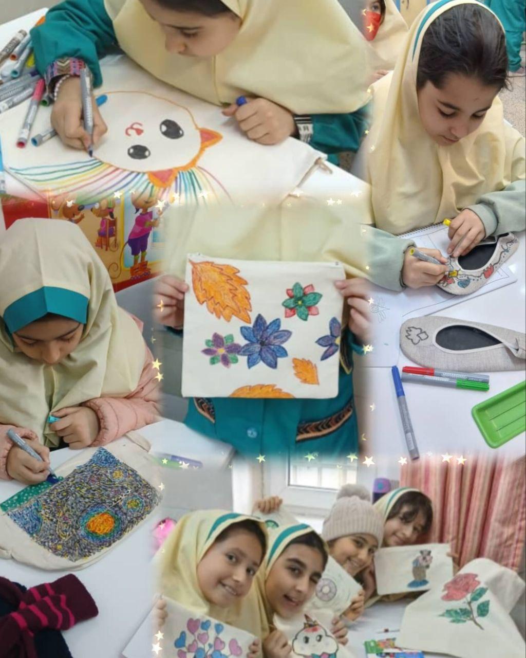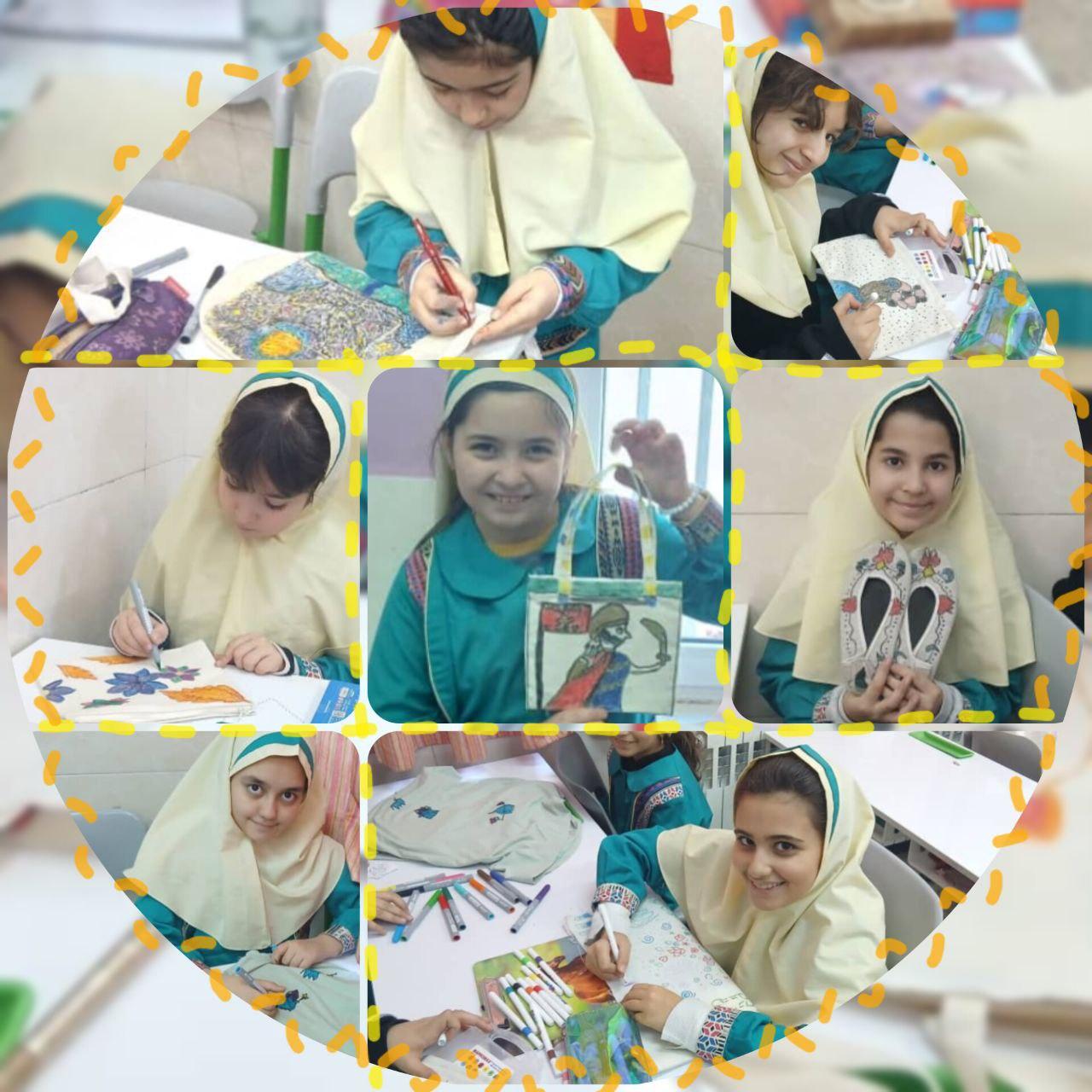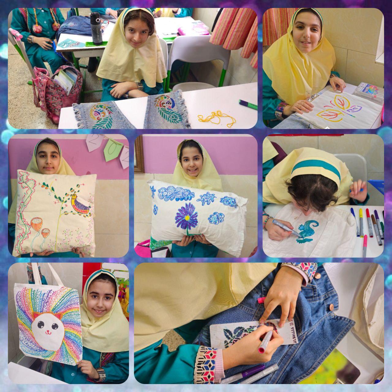 دختران هنردوست پایه چهارم بعد از تجربه ی نقاشی روی پارچه