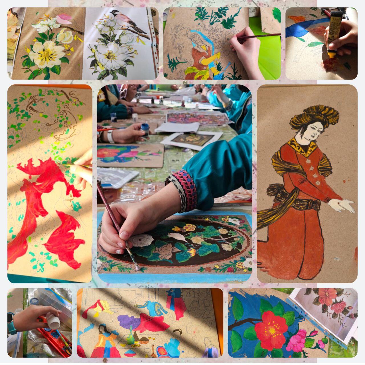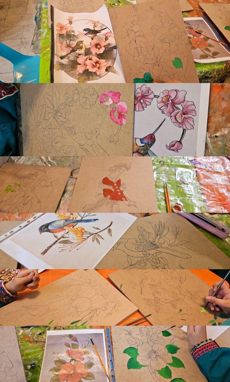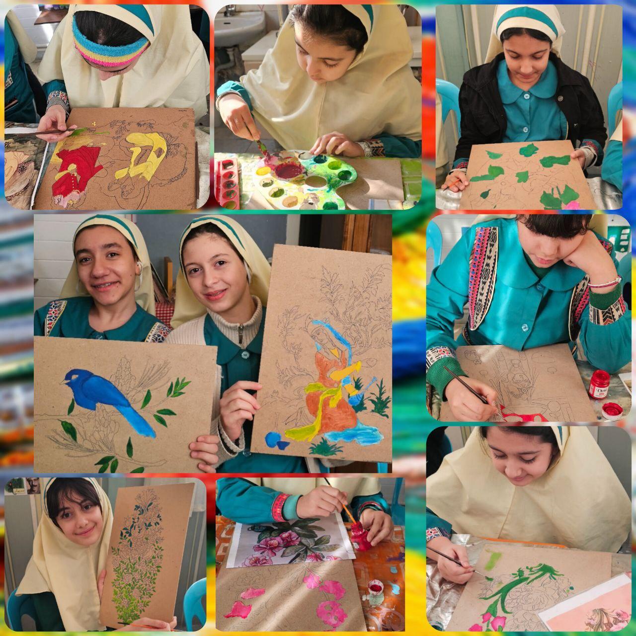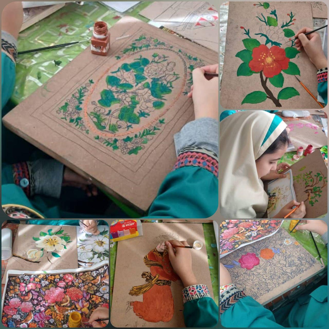 دختران پایهی ششم درحال ادامهی نگارگری خود روی چوب میباشند.