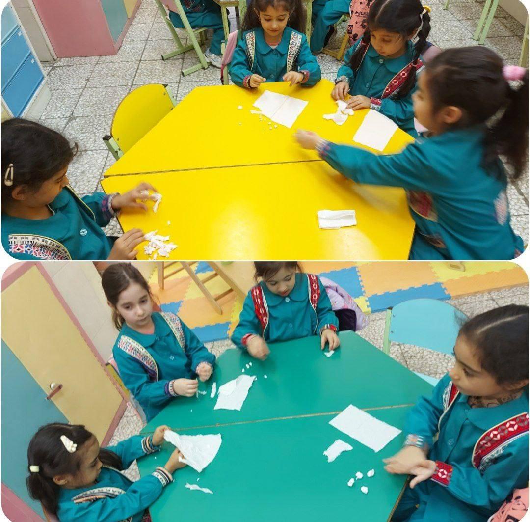 مچاله کردن و چسباندن دستمال کاغذی با هدف تزئین تاج یلدایی