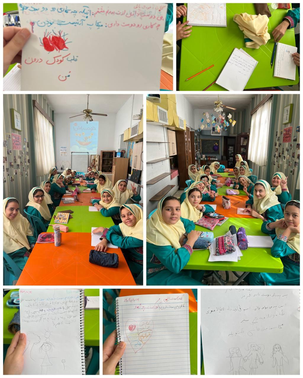 خواندن کتاب «خودت باش!» و صحبت درباره صلح با خود و کودک درونو نوشتن و کشیدن نقاشی با دست غیرمسلط